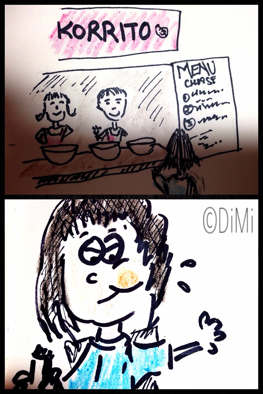 The documentary takes you through Joo’s personal journey and what food means to her, although born in Korea, she moved to the UK when she was three. She found food as a way of staying connected with her homeland. She seeks views from celebrity chefs and food writers about global perspectives on Korean food and journeys to her homeland to discover what makes Korean food so unique. She visits the 100 year old Gwangjang Market in Seoul and discusses adapting tastes to suit different cultural palettes. After hungrily watching the mini documentary, I was glad to be able to stuff my face with an interesting mix of Korean Mexican food – the chicken burrito with Kimchi fried rice at the Korrito food stall. It was delicious and because I was unable to take a selfie of me enjoying the burrito, you will have to make do with this quick sketch I produced! Clearly in the second panel, you can see me chewing my buldak chicken burrito which I hold in one hand whilst stretching my other for some apparent reason!