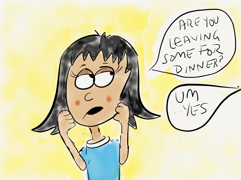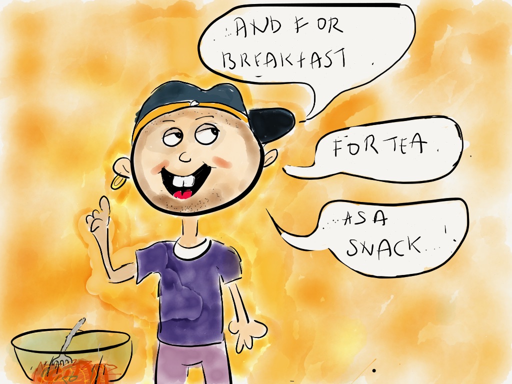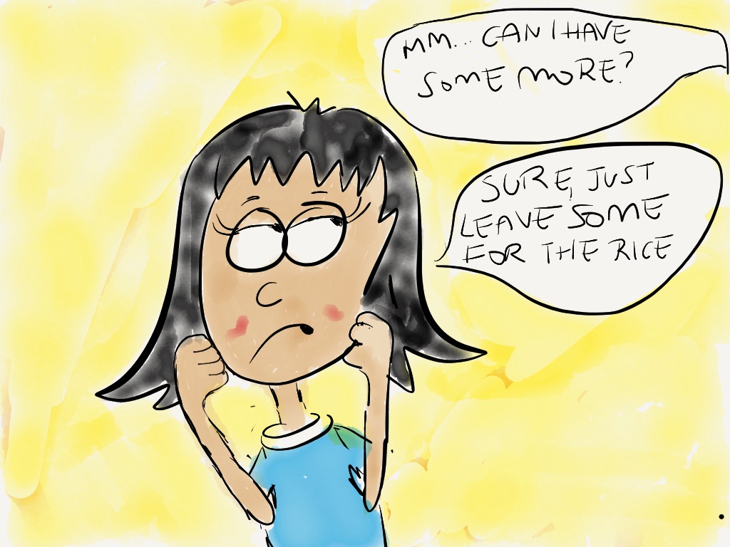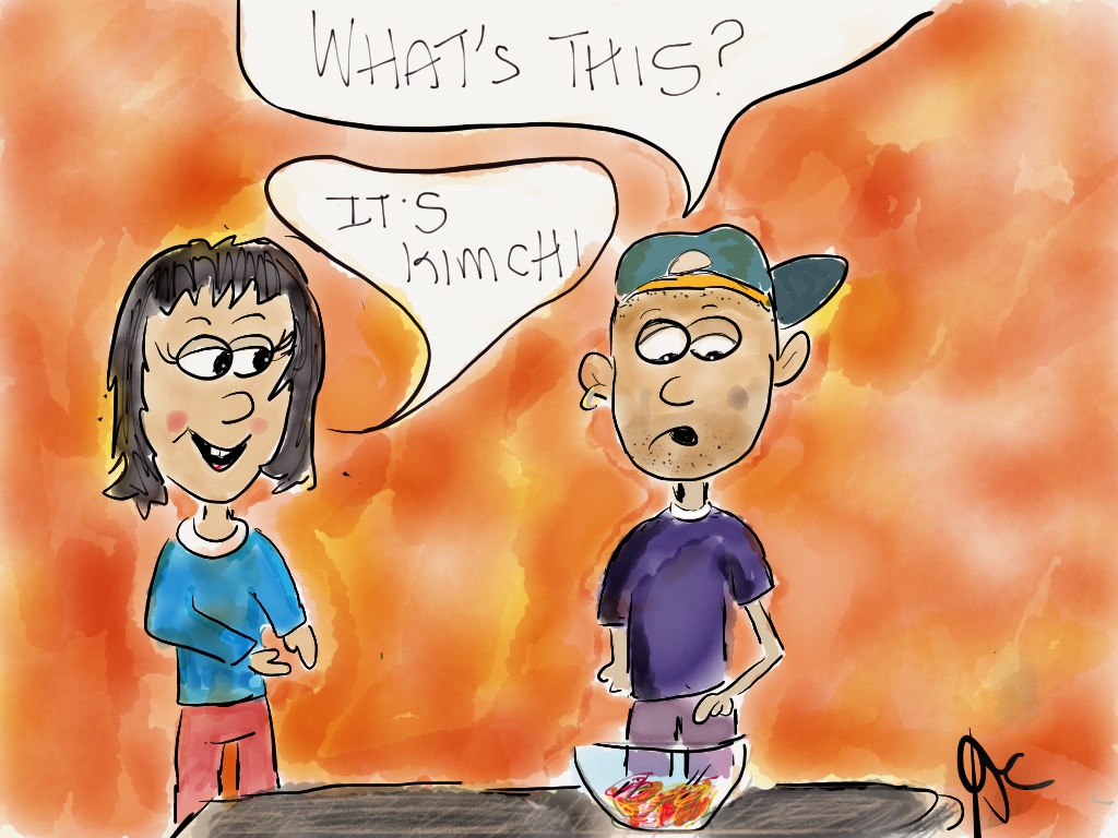 My brother is staying with me for a few weeks and I introduced him to Kimchi rice the other day and he loved it. He has had Kimchi before, but staying with me is the opportunity to have it least once a day if not every other day. Although the comic below is a slight exaggeration of the situation where he would polish off my Kimchi supply, it is still true! He now has it with everything!